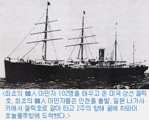 ¡ºÃ¹ À̹ÎÀÚµéÀº 1902³â 12¿ù22ÀÏ Á¦¹°Æ÷Ç×(úÞ ÀÎõÇ×)¿¡¼ ÀϺ» ³ª°¡»çŰú¼ °ÕÄ«ÀÌÈ£¸¦ Ÿ°í ³ª°¡»çŰ·Î °£ ´ÙÀ½ 1903³â 1¿ù1ÀÏ ³ª°¡»çŰ¿¡¼ ÇÏ¿ÍÀÌ·Î °¡´Â ¹Ì±¹ »ó¼± °¶¸¯È£·Î °¥¾ÆÅÀ½À´Ï´Ù. 2ÁÖ¿¡ °ÉÄ£ Ç×ÇØ ³¡¿¡ È£³î·ê·ç¿¡ µµÂøÇÑ ùÛìÑÀº ºÎÄ£À» Æ÷ÇÔÇÏ¿© ¼ºÀÎ ³²ÀÚ 56¸í(Å뿪 2¸í Æ÷ÇÔ), ¿©ÀÚ 21¸í, ¹Ì¼º³âÀÚ(14¼¼ ¹Ì¸¸ÀÇ ¼Ò³â ¼Ò³à) 25¸íÀ̾ú´Ù°í ÇÕ´Ï´Ù¡»