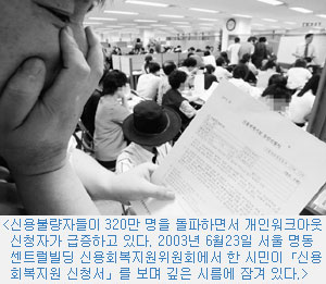 지난 7월30일, 서울 중구 명동 센트럴빌딩에 있는 신용회복지원위원회. 무더운 날씨에도 불구하고 이 빌딩 6층의 개인워크아웃 신청부서에는 사람들로 북적거렸다.