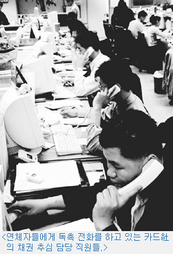 『私債업자들은 돈이 필요해서 온 사람들에게 돈을 빌려 주면서 카드신청서를 하나 작성해 달라고 이야기한다. 이렇게 작성된 카드신청서가 지점장들에게 대량으로 넘어갔다. 私債업자를 찾아오는 사람들은 거의 예비 신용불량자들이다. 어느 카드社는 「연체가 있는 경우에 연체금액이 200만원 이하일 때 카드를 발급할 수있다」는 자체 기준을 정해 놓기도 했다. 이렇게 예비 신용불량자에게 무분별하게 신용카드가 발급됐다』