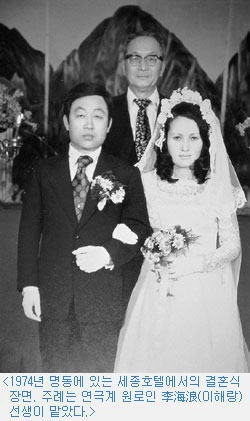그는 1974년 초여름, 디자인을 전공한 河正淑(하정숙ㆍ64)씨와 6년간의 연애 끝에 결혼한다. 연극에 미쳐 있을 때, 연극 후배가 소개를 해준 것이었다고 한다. 두사람은 서울 중구 퇴계로에 있는 세종호텔에서 원로 연극인인 李海浪(이해랑ㆍ1916~1989) 선생의 주례로 결혼식을 올렸다.