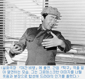 그러나 그의 스타성을 일깨워 준 작품은 1979년의 「야간 비행」이었다. 그는 실화극장 「야간 비행」에서 간첩 「탁구」 役으로 스타의 반열에 오른다. 오버 액션을 통해 만든 그로테스크(奇怪)와 패러디, 너털웃음은 드라마의 트레이드 마크가 됐다.