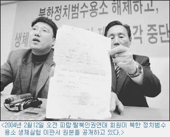 지난 2월에는 영국의 BBC 방송이 1999년 北京 주재 북한대사관 무관으로 근무했다는 귀순자 권혁씨의 생체실험 목격담을 보도했다. 權씨는 『1993년 함경도 회령에 있는 제22 정치범 수용소 경비대장으로 있을 때 부모와 어린 아들·딸 등 한 가족이 유리로 된 가스실에서 화학무기 생체실험으로 죽는 것을 목격했다』고 주장했다.