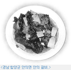 사대부집 교자상과 궁중 수라상에 오른 왕갈비찜은 경남 함양군 안의가 유명하다. 안의에는 소가 누워 있는 형상이라 하여 「쇠부리」라는 이름을 가진 마을이 있고, 관북마을 들 한켠에는 전국에서 유일하게 白丁(백정)의 효자비석이 세워져 있다. 백정 하면 천민 중에 천민으로, 조선시대에 백정의 효자비가 세워졌다는 것은 파격적이다.