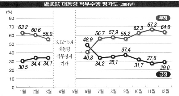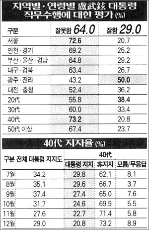 연령별로는 40代(73.2%), 50代 이상(67.4%), 30代(60%)순으로 盧대통령의 직무수행에 부정적이었다.