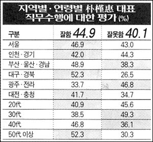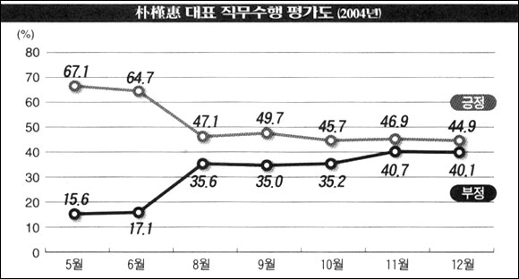 한나라당 朴槿惠(박근혜) 대표의 직무수행에 대해 「잘하고 있다」는 긍정적 평가는 44.9%(「매우 잘하는 편」 3.3% + 「잘하는 편」 41.6%)로, 「잘못하고 있다」는 부정적 평가 40.1%(「매우 잘못하는 편」 5.7% + 「잘못하는 편」 34.4%)보다 높았다. 지난 11월 조사와 비교해 볼 때 큰 변동이 없었다.朴대표의 직무수행에 대한 「긍정적 평가」가 높은 응답층은 ▲50代 이상(52.3%) ▲가정주부(52.2%) ▲대구ㆍ경북 거주자(52.3%) ▲한나라당 지지자(69.8%) 등이다. 「부정적 평가」는 ▲남자(44.1%) ▲30代(49.3%) ▲학력이 높을수록(대학 이상 46.4%) ▲블루칼라(56.3%) ▲열린당(55.7%) 및 민주노동당(55.2%) 지지자와 무당파(46.0%)에서 상대적으로 높게 나타났다.