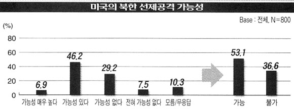 미국의 對北 선제공격 가능성에 대해서는 53.1%가 「가능성이 있다」고 응답했다. 「가능성이 없다」라는 응답은 36.6%로 조사됐다. 「선제공격 가능성」의 응답은 ▲연령이 낮을수록(20代 64.3%) ▲학력이 높을수록(대학 이상 61.8%) ▲학생(71.7%) ▲400만원 이상 소득층(66.9%) ▲민주노동당 지지자(64.4%)에서 특히 높게 나타났다.