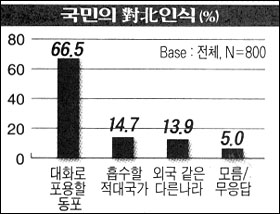 북한을 「대화로 포용해야 할 동포」라고 답변한 응답자는 전체의 66.5%로 조사됐다. 「흡수해야 할 敵對국가」라는 응답(14.7%)과 「외국과 다름없는 다른 나라」라는 응답(13.9%)을 합하면 28.6%로 북한에 대해 무관심하거나 적대적인 것으로 드러났다.