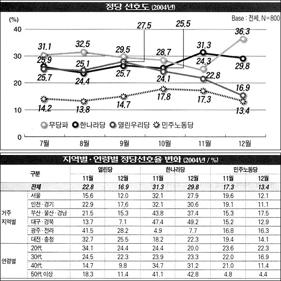열린당과 민노당에 대한 지지도가 감소하면서 무당파가 큰 폭으로 상승하고 있다. 이번 조사에서 열린당은 모든 계층에서 지지를 잃고 있는 것으로 나타났다.