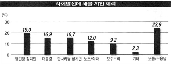 「2004년 우리 사회의 발전에 어떤 집단이 가장 큰 해를 끼쳤다고 보는가」 질문한 결과, 「열린당 정치인」이라는 응답이 19.0%로 가장 높게 나타났다. 이어 대통령(16.9%), 한나라당 정치인(16.7%), 노조ㆍ좌파(12.0%), 보수우익(9.2%) 順으로 조사됐다. 응답자들은 사회발전 저해의 책임을 정치권에 묻고 있었다.