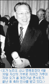 ¡¸°¡·çÀÌÀÚ¿Í ¿À°¡ Ȧ¡¹Àº ¼Ò´Ï ¸í¿¹È¸ÀåÀÎ ¿À°¡ ³ë¸®¿À(ÓÞùÅîðê©¡¤75)¾¾°¡ 2002³â ¼Ò´ÏȸÀå¿¡¼ ¸í¿¹È¸ÀåÀ¸·Î ¹°·¯³ª¸é¼ ¹ÞÀº ÅðÁ÷±Ý 16¾ï ¿£(ÇÑÈ 160¾ï¿ø »ó´ç) Àü¾×À» Èñ»çÇØ¼ Áö¾îÁø °ÍÀÌ´Ù. ±×¶§ ±×´Â ¡ºÀڽĵµ ¾ø°í ÅðÁ÷±ÝÀ» ¹ÞÀ» »ý°¢µµ ¾ø¾ú´Ù¡»°í ¸»Çß´Ù. À̹ø °ø¿¬Àº ÈçÄèÈ÷ »çÀ縦 Åоî ÄܼƮ ȦÀ» Áþ°Ô ÇØÁØ ¿À°¡ ȸÀåÀ» À§ÇÑ À½¾ÇȸÀÎ °ÍÀÌ´Ù.