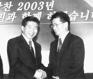 | 2003년 1월3일 당시 서울 여의도 민주당 黨舍 강당에서 열린 신년회에서 盧武鉉 대통령 당선자와 柳鍾珌씨가 악수를 나누고 있다. 이날 두 사람 간 악수는 마지막 만남이 되었다. |