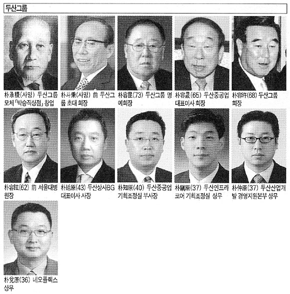대한민국 최장수 기업인 두산그룹의 경우, 오너들의 은행 근무 코스도 눈에 띈다. 현재 두산그룹의 실무를 총괄하고 있는 朴容晩(박용만·50) 부회장은 서울大 경영학과를 졸업한 뒤 외환은행에서 직장생활을 시작했다. 朴容昆 명예회장은 산업은행, 朴容晟 두산중공업 회장은 상업은행 근무 경험을 각각 가지고 있다.