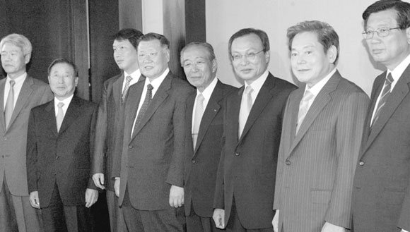 - 전경련 회장단이 지난 6월16일 서울 호텔신라에서 월례회의를 마치고 기념사진을 찍고 있다. 왼쪽 두 번째부터 조석래 효성그룹 회장, 최태원 SK그룹 회장, 정몽구 현대차그룹 회장, 강신호 전경련 회장, 이해찬 국무총리, 이건희 삼성그룹 회장.
