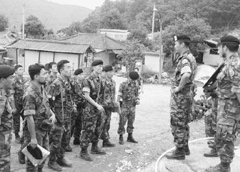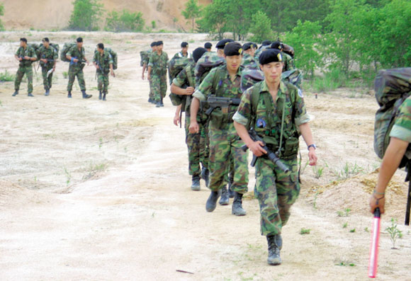 1.5km쯤 지난 지점부터 점점 행군 행렬에서 뒤처지기 시작했다. 한 발짝 떼어 놓을 때마다 대원들은 두 발짝 세 발짝을 앞서간다. 행렬을 앞에서 이끌던 12중대 중대장 鄭大將(정대장ㆍ28) 대위가 다가왔다.
