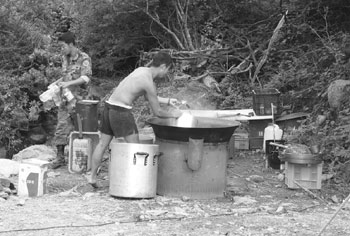 숙영지 입구 쪽에 간이로 만든 샤워 시설에서 몇몇 병사가 샤워를 준비한다. 냇가나 하천을 제외하고 샤워 시설을 이용하는 것은 처음이다. 최소 5명 이상이 모여야 물을 사용할 수 있다. 그러나 대원들은 씻는 것보다 자는 것이 좋다.