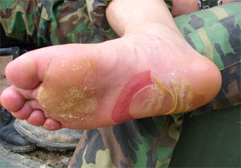 | 발바닥 전체에 물집이 잡혀 살갗이 벗겨진 김상원 하사의 발. |