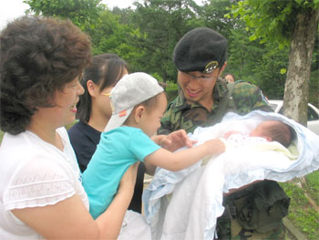 | 태어난 지 3일된 아들을 안고 웃고 있는 14중대장 윤지현 대위. |