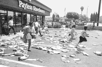 | 1992년 4월30일 로스앤젤레스의 크렌쇼 앤 제퍼슨 지역에서 약탈자들이 신발을 훔쳐 달아나고 있다. |