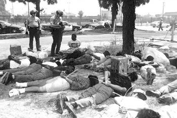 | 1992년 4월30일, 경찰이 LA폭동 용의자들을 체포하고 있다. |