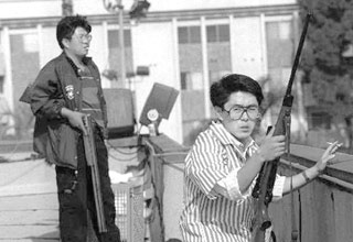 - 1992년 4월30일, 두 명의 韓人교포들이 폭도들의 약탈을 방지하기 위해 청과물가게 지붕 위에서 총을 들고 서 있다.