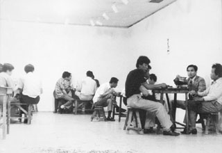 | 서울 명동화랑에서 열린 李康昭의 1회 개인전「주막집」. 막걸리집에 있는 탁자와 의자를 그대로 옮겨 놓고 작가와 관람객들이 막걸리를 마시는「퍼포먼스」가 그의 첫 전시회였다. |