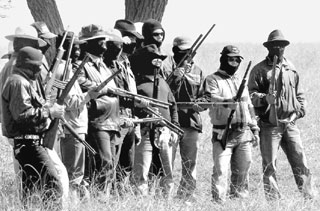 | 2003년 브라질에서는 농지개혁을 주장하는 농민들이 농장을 무단 점거하는 사태가 빈발했다. 사진은 농장을 지키고 있는 무장 사설경비원들. |