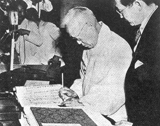 | 제헌헌법에 서명하는 李承晩 대통령. 李대통령은 농지개혁을 강력하게 추진했다. |