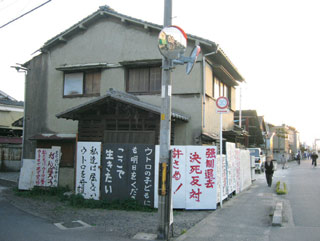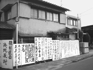 어쨌든 작년 3월 京都지법에서 새 주인으로 인정된 이노우에氏는 땅값을 11억 엔으로 정하고 우토로 주민들에게 사라고 했다. 주민들의 반응이 시원치 않자 그는 마을의 빈 집을 골라 「시범 강제철거」를 예고한다.