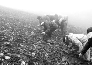 | 숲을 밀어내고 조성된 슬로프에 산나물과 야생화를 심고 있는 모습. 슬로프를 토종 산나물과 야생화로 녹화하는 것은 강원랜드 스키장이 국내 최초다. |