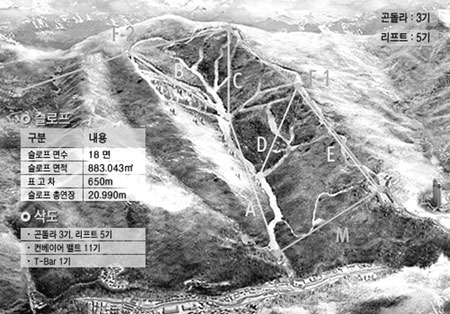○ 슬로프 : 총연장 21km(18면. 슬로프 면적 약 28만 평)