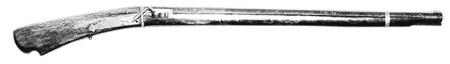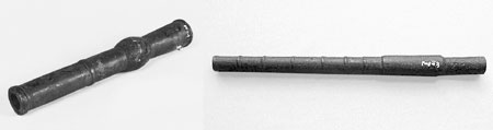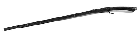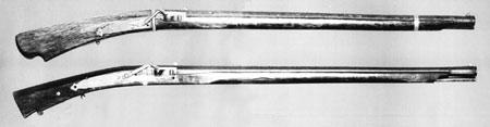 | 위쪽은 포르투갈 傳來 철포(가고시마縣 지정문화재), 아래쪽은 傳 八板金兵衛 제작 種子島銃(니시노오모테市 지정문화재). |