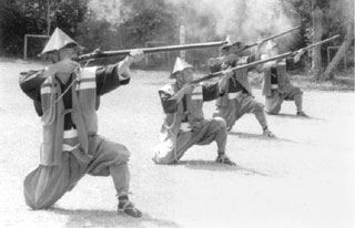 - 種子島화승총보존회의 철포 試射. 임진왜란 당시 일본 보병의 모습을 방불케 한다.
