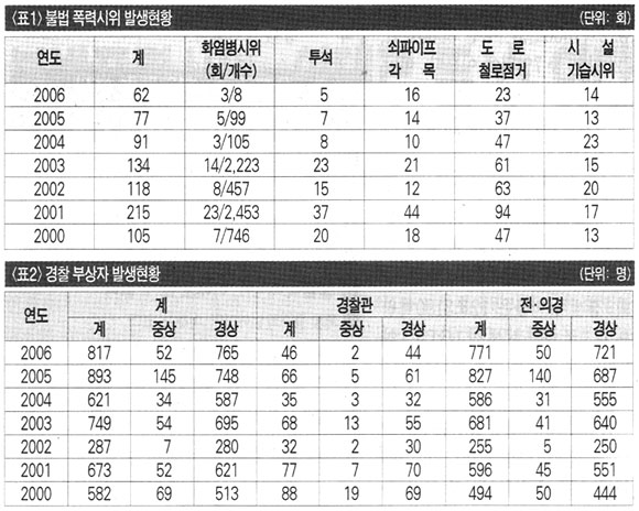 2000년 이후 전국에서는 매년 1만여 건이 넘는 크고 작은 집회와 시위가 열렸다. 이 중 불법폭력시위 횟수는 2000년 105회, 2001년 215회, 2002년 11회, 2003년 134회, 2004년 91회, 2005년 77회, 2006년 62회로 매년 감소하고 있다 <표1>.