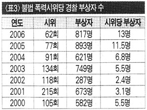 폭력시위 건수의 감소에도 불구하고 경찰부상자 수와 시위 횟수당 경찰 부상자 수는 매년 증가하고 있다<표2, 3>. 2006년에만 817명의 경찰관(경찰 46명, 전·의경 771명)이 부상을 당했다. 2006년에 발생한 불법폭력시위가 62회이니 불법시위 1건당 13명의 경찰관이 다친 것이다. 경찰관들의 부상 실상은 참혹하다. 경찰병원에 가보면, 시위대가 휘두른 쇠파이프나 각목에 맞아 수십 바늘을 꿰맨 경찰, 갈비뼈가 부서진 경찰, 집단폭행으로 腸(장)파열이나 타박상을 입은 경찰, LPG가스통 폭발이나 화염병으로 인해 화상을 입은 의경, 돌진하는 트럭에 부딪혀 양다리가 파열된 경찰, 낫·삽·죽창에 찔리거나 해머에 맞은 의경, 돌에 맞아 실명한 의경들을 쉽게 만날 수 있다. 2003년 부안사태 때에는 시위대가 부상경찰 후송 구급차를 포위해 부상경찰들을 끌어낸 후 무차별 폭행했다.