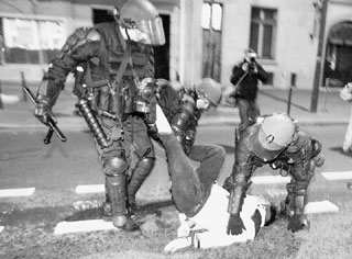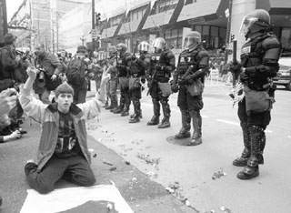 | 1999년 12월 美 시애틀市의 폭동진압 경찰관들이 反세계화 시위대원들을 체포해 무릎 꿇려 놓고 있다. |