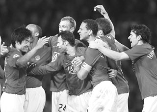 - 지난 4월30일 2007/2008 시즌 유럽축구연맹(UEFA) 챔피언스 리그 4강 2차전 FC바르셀로나와의 경기에서 승리한 후 동료들과 기뻐하는 박지성(왼쪽).