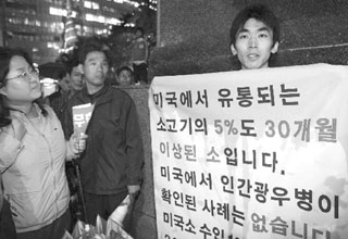 | 2008년 6월 4일 저녁 청계광장 근처에서 미국산 소고기 수입에 찬성하는 1인 시위를 하는 대학생 李世珍 씨에게 미국산 소고기 수입에 반대하는 사람들이 항의하고 있다. |