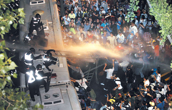 | 경찰이 시위군중을 향해 물대포를 쏘고 있다. |