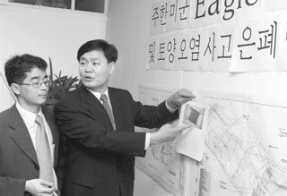 | 녹색연합 사무처장 시절이던 2000년 9월 25일 주한미군기지의 폐유 유출 의혹을 제기하는 임삼진 시민사회비서관(오른쪽). |