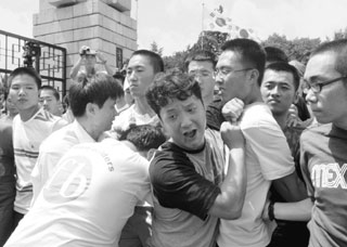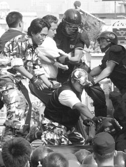 | 2005년 8월 14일 북한대표단의 국립현충원 참배 반대 집회에서 경찰과 몸싸움을 벌이는 장기정 씨(가운데). |