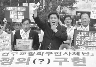 | 지난 7월 4일 서울 명동성당 앞에서 천주교정의구현사제단 해체촉구 기자회견을 벌이는 봉태홍 라이트코리아 대표. |