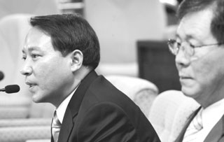 | 2006년 11월 국정원장 인사청문회에서 1980년대 주사파의 실태에 대해 증언하는 강길모 프리존 대표(왼쪽). |