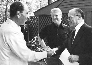 | 카터 美 대통령(가운데)의 주선으로 캠프 데이비드에서 만난 사다트 이집트 대통령(왼쪽)과 메나헴 베긴 이스라엘 총리(오른쪽). |