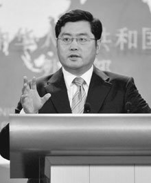 친강 대변인은 지난해 5월 李明博(이명박) 대통령이 중국을 방문하고 있을 때 “한미동맹은 냉전시대가 남긴 역사적 유물”이라고 말해 화제가 됐던 인물이다. 그는 자신의 ‘역사적 유물’ 발언 때문에 “상대방 국가 원수 방문 중에 어떻게 그런 논평을…”이라고 우리 외교 라인이 항의하자 이틀 뒤 “내가 한 표현은 완전하면서도 계통을 밟아 이뤄진 것”이라면서 우리 외교라인의 항의를 깔아뭉개 더 큰 화제를 만들어 냈다.