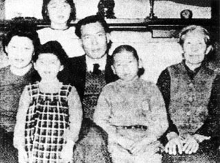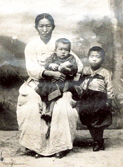 - 안중근의 직계유족. 오른쪽부터 안중근의 부인 김아려, 손자 웅호, 아들 준생, 손녀 연호와 선호, 안준생의 부인 정옥녀.