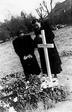| 1949년 3월 상하이 만국공묘에 있는 안정근의 묘 앞에서 오열하는 부인 이정서 여사와 딸 미생(오른쪽). |