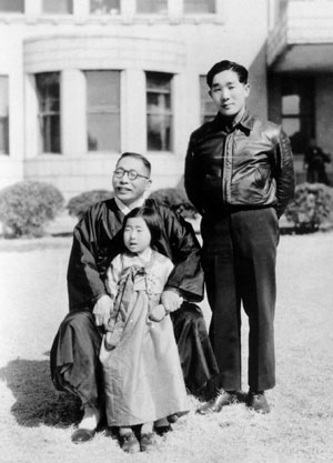 | 경교장의 백범 김구와 손녀 효자. 오른쪽은 김구의 차남 김신(전 교통부 장관). |