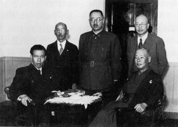 | 1939년 10월 16일, 조선호텔에서 안중근 아들 안준생(왼쪽)이 이토 히로부미의 둘째 아들 이토 분기치(오른쪽 첫 번째 앞줄)를 만나 아버지를 대신해 사죄한다고 말했다. 뒤에 선 사람은 조선총독부 외사과장 마자와 다쓰오(중앙)와 아이바 기요시 촉탁(오른쪽)이다. |