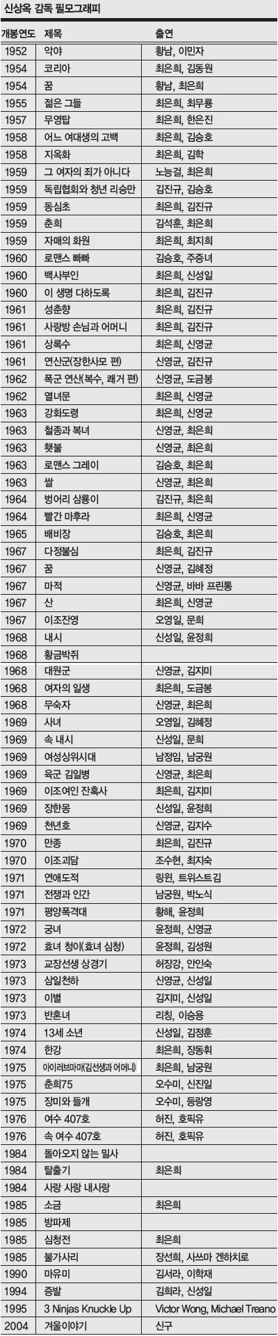 ÀÌ·± ¿µÈ °°Àº ±×ÀÇ ÀλýÀ» À̵¥¿Ã·Î±âÀûÀ¸·Î ÆÇ°¡¸§ÇÏ·Á¸é ÀÌÇØÇÒ ¼ö ¾ø´Â ºÎºÐÀÌ ÀûÁö ¾Ê´Ù. ÇÏÁö¸¸ ±× ¸ðµç º¹ÀâÇÑ »ç¿¬ ¼Ó¿¡¼ ±×°¡ Æò»ý ¿À·ÎÁö ¿µÈ¸¸ ¹Ù¶óº» ¿Á¤¸¸À» ÃßÃâÇØ ³½´Ù¸é, ±×ÀÇ ¿µÈ¿¡ »ö±òÀ» ³ª´©´Â ÀÛ¾÷Àº ±×´ÙÁö Àǹ̰¡ ¾ø¾î º¸ÀδÙ. ±×·¡¼ ½ÅÇʸ² Çã°¡°¡ Ãë¼ÒµÈ ÈÄ ¾î´À ³¯ °©Àڱ⠺ÏÇÑ °øÀÛ¿ø¿¡ ÀÇÇØ ¡®³³Ä¡¡¯µÈ ±×°¡ ºÏÇÑ¿¡¼ ¡®½ÅÇʸ²¿µÈÃÔ¿µ¼Ò¡¯ÀÇ ÃÑÀåÀ¸·Î ÃÖÀºÈñ¾¾¿¡°Ô ¸ð½ºÅ©¹Ù ¿µÈÁ¦ ÃÖ¿ì¼ö¿©¿ìÁÖ¿¬»óÀ» ¾È±ä <¼Ò±Ý>(1985)°ú °°Àº ¿µÈ¸¦ ¿½ÉÈ÷ ¸¸µé¾ú´Ù°í ÇØ¼ ÀÌ»óÇÑ ´«À¸·Î ¹Ù¶óº¼ ÇÊ¿ä´Â ¾øÀ» °Í °°´Ù. Áö³ 10¿ùÈ£ ÀÌ Äڳʿ¡ ÀÛǰ¼¼°è¸¦ ¼Ò°³ÇÑ Á¤Ã¢È °¨µ¶Àº ÀÎÅͺ信¼ È«Äá¿¡¼ ¸¶Áö¸·À¸·Î º» ½Å °¨µ¶ÀÇ ¸ð½ÀÀ» ±â¾ïÇÏ¸ç ³³Ä¡°¡ ¾Æ´Ï¾úÀ» °¡´É¼ºÀÌ ³ô´Ù´Â ¸»À» Çϱ⵵ Çß´Ù. ÀÌ·¸°Ô ÀÇȤÀº ¿©ÀüÇÏÁö¸¸, ±×ÀÇ °ü½ÉÀÌ À̵¥¿Ã·Î±â¿´´Ù¸é ¸Å³â 300¸¸ ´Þ·¯¸¦ ½èÀ» ¸¸Å ¹«Á¦ÇÑÀû Á¦ÀÛºñ·Î ¿µÈ¸¦ ¸¸µé ¼ö ÀÖ´Â ºÏÇÑ¿¡¼ ¡®¿ì»ó¼þ¹è¡¯ÀÇ Á·¼â¸¦ ä¿ì·Á ÇÏÀÚ ´Ù½Ã ³²ÂÊÀ¸·Î Å»ÃâÇÏ´Â ¸ðÇèÀ» °¨ÇàÇÏÁö ¾Ê¾ÒÀ» °ÍÀ̱⠶§¹®ÀÌ´Ù. ±×ÀÇ ¿µÈȰµ¿ º»°ÅÁö´Â 1960~70³â´ë´Â ³²ÇÑ, 1980³â´ë´Â ºÏÇÑ, 1990³â´ë´Â ¹Ì±¹À̾ú´Ù. À̺¸´Ù ´õ µå¶ó¸¶Æ½ÇÑ »îÀÌ ÀÖÀ»±î? ±×ÀÇ ¾î¶² ¿µÈµµ ±×ÀÇ »îÀ» µû¶ó°¡Áö´Â ¸øÇÒ °Í °°´Ù.