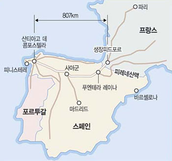 | 프랑스 파리(Paris)에서 스페인의 산티아고 데 콤포스텔라(Santiago de Compostela)로 가는 여정. 파리 몽파르나스역에서 생 장 피드포르까지는 기차를 타고 이동한다. 생 장 피드포르부터 약 800km의 순례길이 시작된다. |